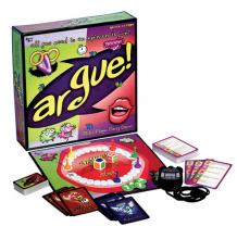 Included with Argue is 1,000 topics, a precision timer and 100 optional Distraction Cards. These can be used to make arguing more of a challenge by causing players to perform outrageous stunts, such as arguing "while smelling your left shoe" or arguing "while jumping up and down for 15 seconds."
