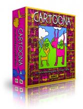 Cartoona is a creature-building, tile-laying game featuring the pop art of Robert Burke. The goal is to be the first player, or team to reach 50 points by building colorful and odd cartoon creatures. This is accomplished by placing tiles of different creature parts together and by playing cards that speed the process, or hinder your opponents. The game box includes 94 creature part tiles, 70 action cards, 8 player screens, and a rules booklet.