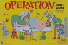 Operation is a dexterity game in which you must extract silly body parts from a hapless patient. In the course of the game you acquire cards which dictate that you must remove a certain piece from the body of the patient. To do this you use a set of tweezers that are attached by wire to the game board. If you are sloppy and touch the metal sides of the hole where the item is located, the patient's pain is indicated by a sudden buzzer and light-up nose. Successful extractions net cash, and the player with the most cash at the end of the game is the winner.